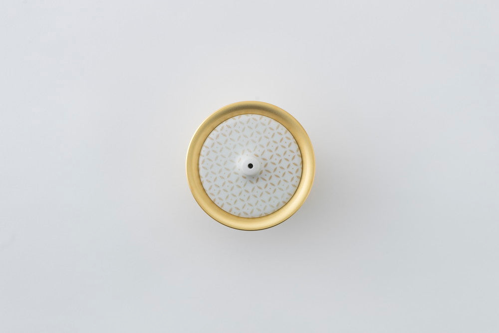 Caroma キャロマささやかに香りで満たす | 讓空間充滿香氣 Caroma 是一個香座與燭台的一體化組合,讓你可以隨時方便地燃點線香、塔香或蠟燭。 上部份是香座,日本製造的陶器蓋能夠一邊安插線香,反轉另一邊可以安座塔香。黃銅香座配以日本傳統花紋更添華麗感覺。 下部份是蠟燭座,可以安全地燃點燭光,帶來舒適放鬆的光線和輕柔的香氣。 Caroma 與 Cherin磬能完美地配合,為你帶來平靜的時刻。