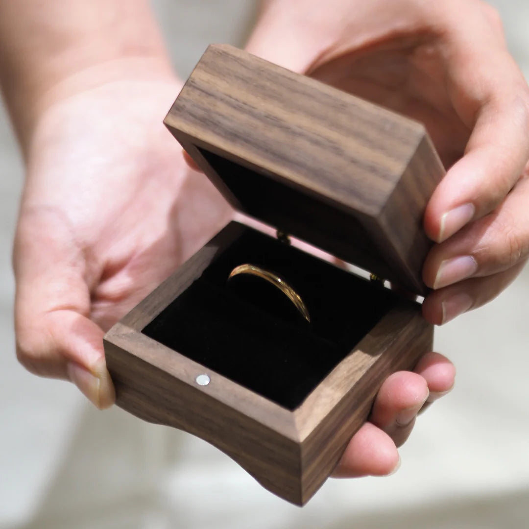 由黑胡桃木製成的戒指盒,簡約平斜修邊與小圓拱底。內籠尺寸可放單戒用!