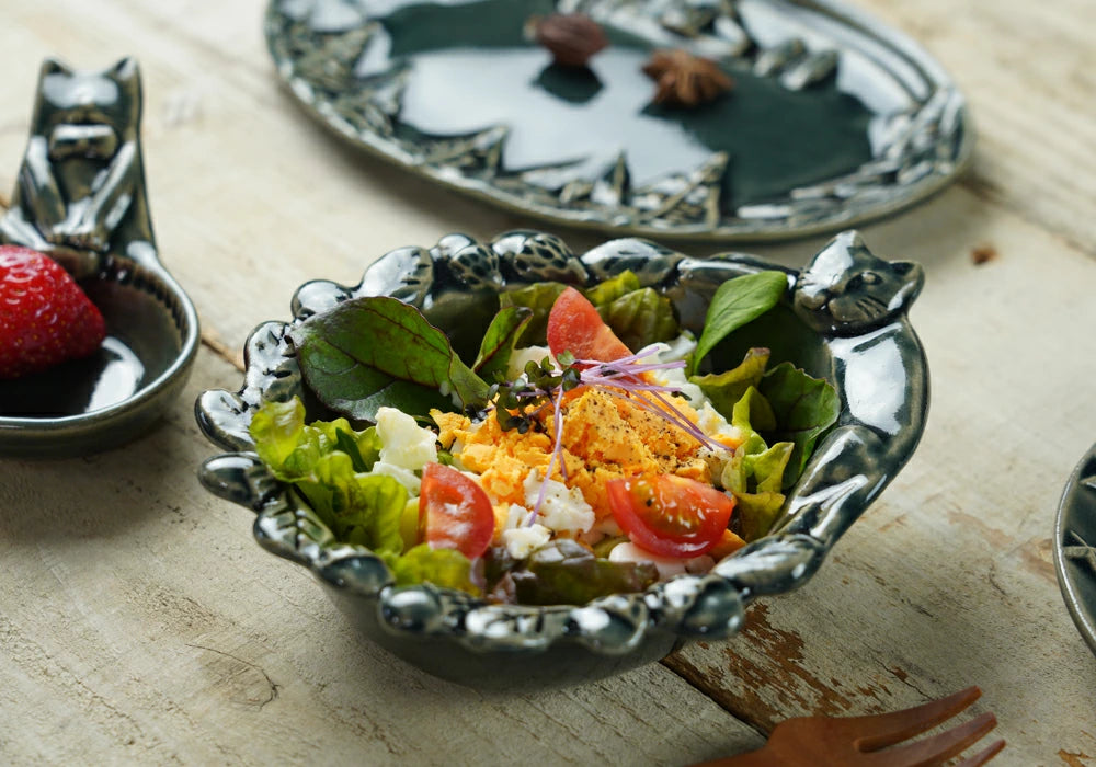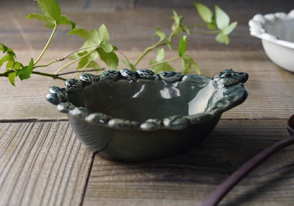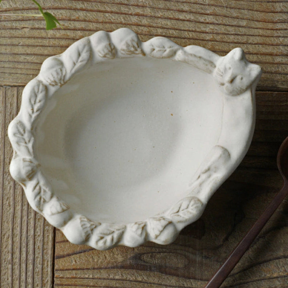益子燒 貓咪與橡果浮雕配菜碗