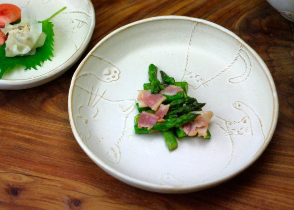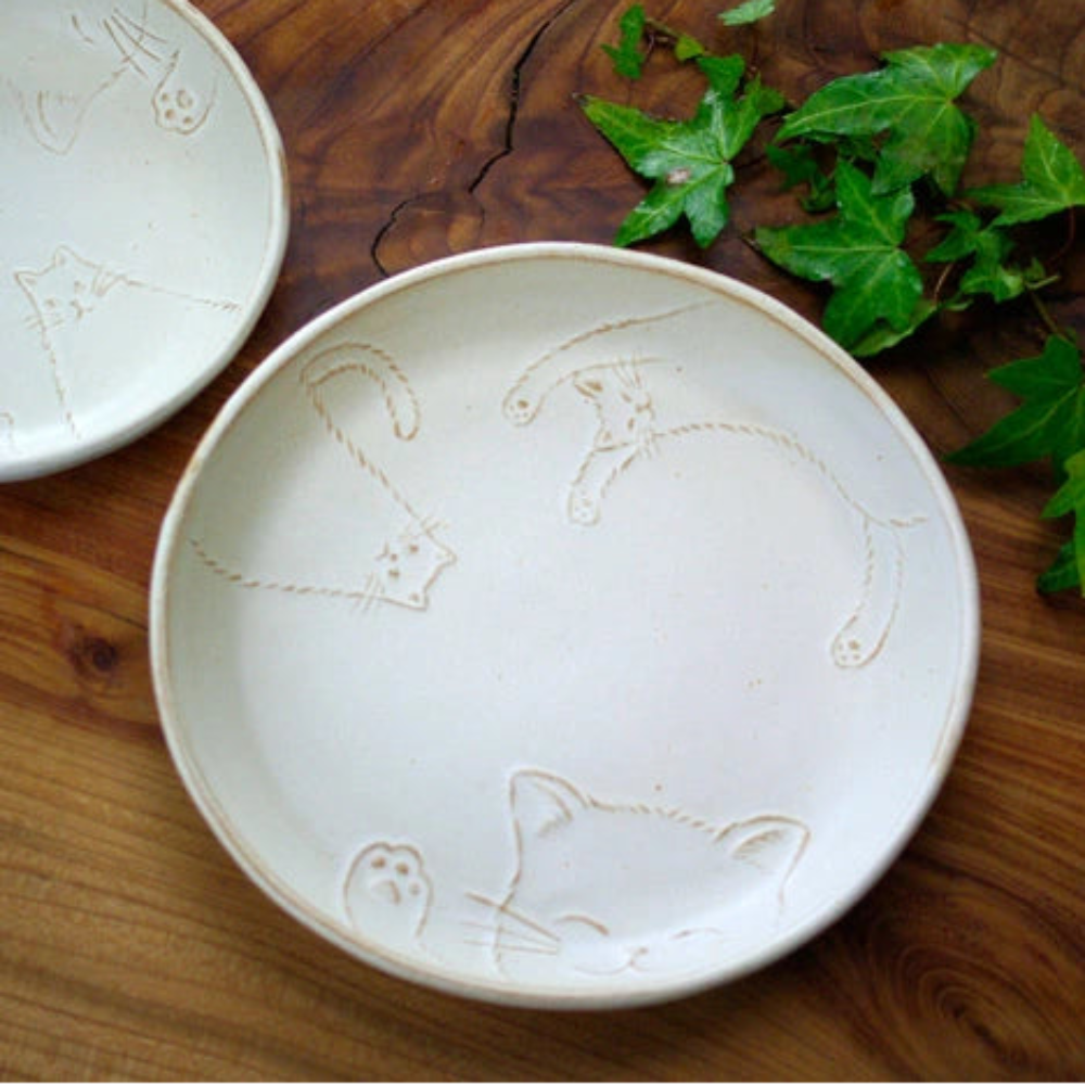 柔和的象牙色讓貓咪浮雕圖案更加引人注目。真是太可愛了!柔和的色彩營造出溫馨愉悅的餐桌氛圍。圓邊放置了栩栩如生的三隻貓咪浮雕。