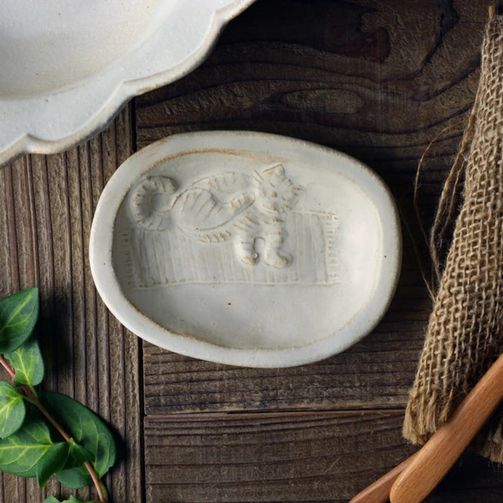 這款小巧的橢圓形碟子飾有栩栩如生的浮雕貓咪圖案。其迷你尺寸非常適合用作調味碟、佐料碟或甜點碟。此外,它也推薦用作雜物托盤。