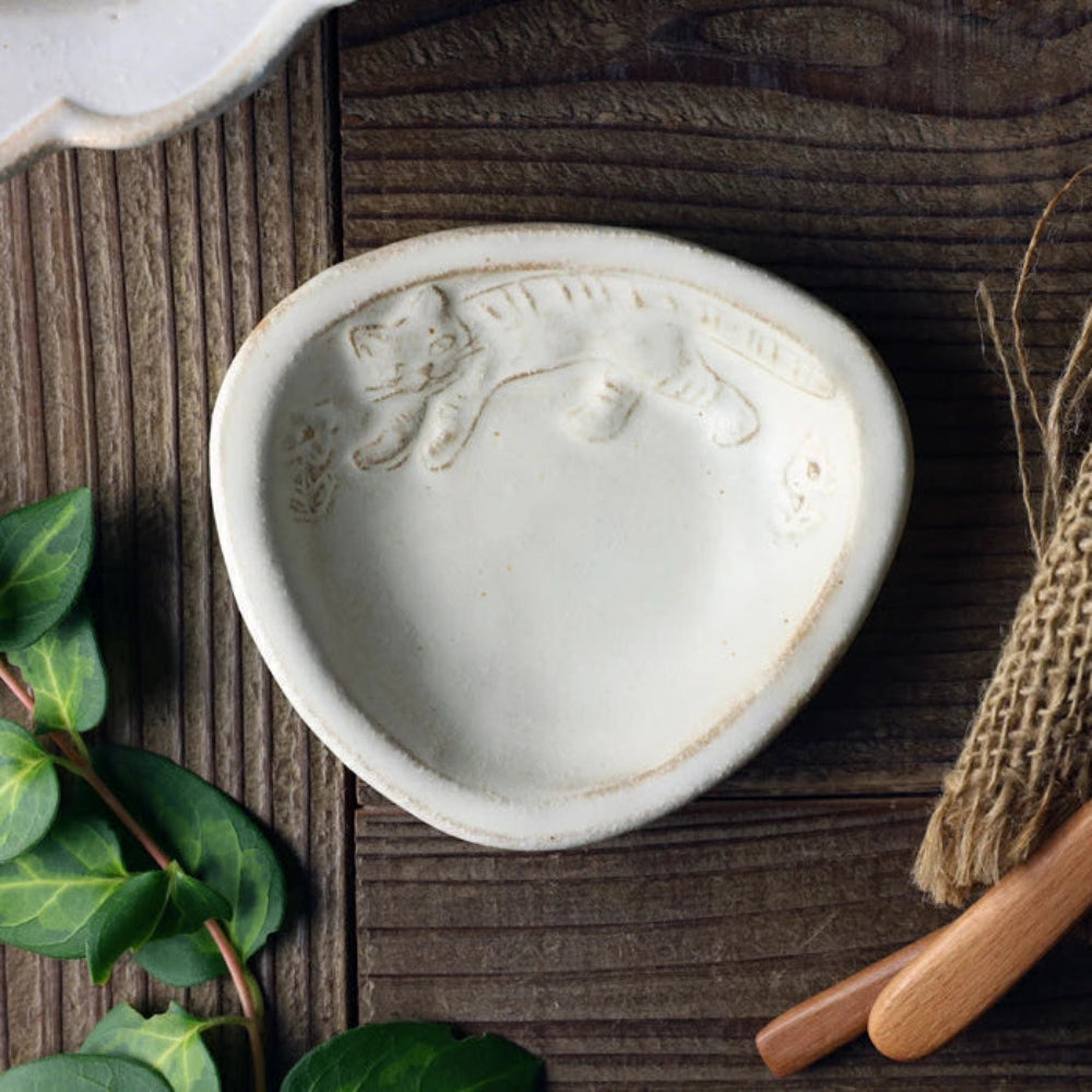 這款小巧的碟子上飾有栩栩如生的浮雕貓咪圖案。迷你尺寸非常適合用作調味碟、佐料碟或甜點碟。它也推薦用作雜物托盤。