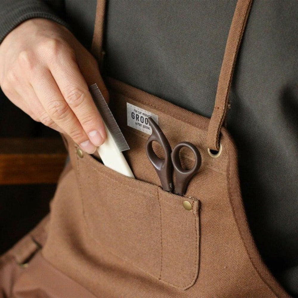這款圍裙方便修剪貓咪指甲和梳毛。胸前設有口袋,可存放剪刀、刷子和其他貓咪護理用品。扣上下擺的紐扣,圍裙即可變成簸箕的形狀,有效防止貓爪和毛髮飛濺。除塵部分採用防毛布料,更容易清潔。這款圍裙設計舒適,適合日常使用,例如作為烹飪圍裙。