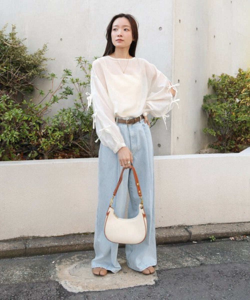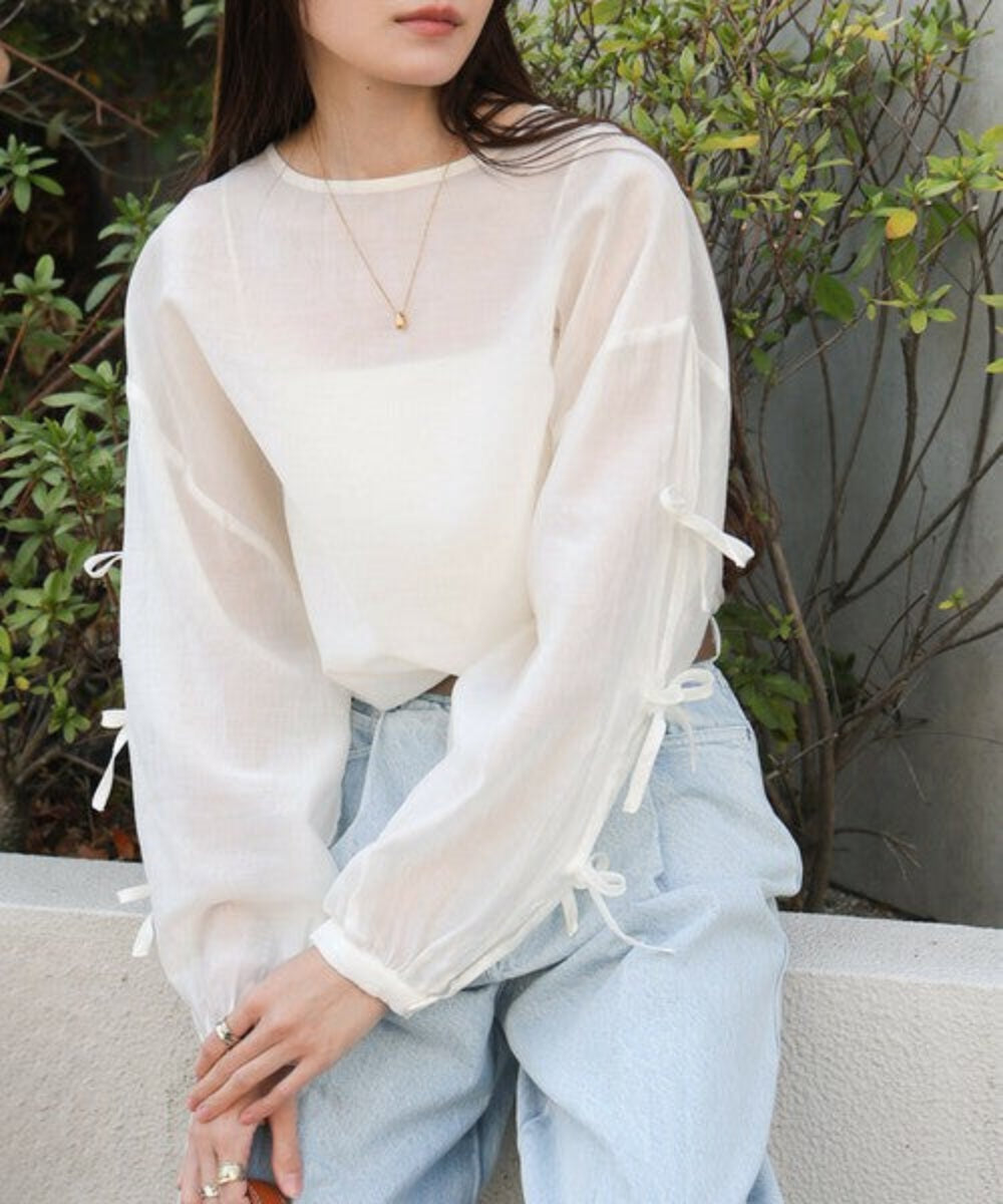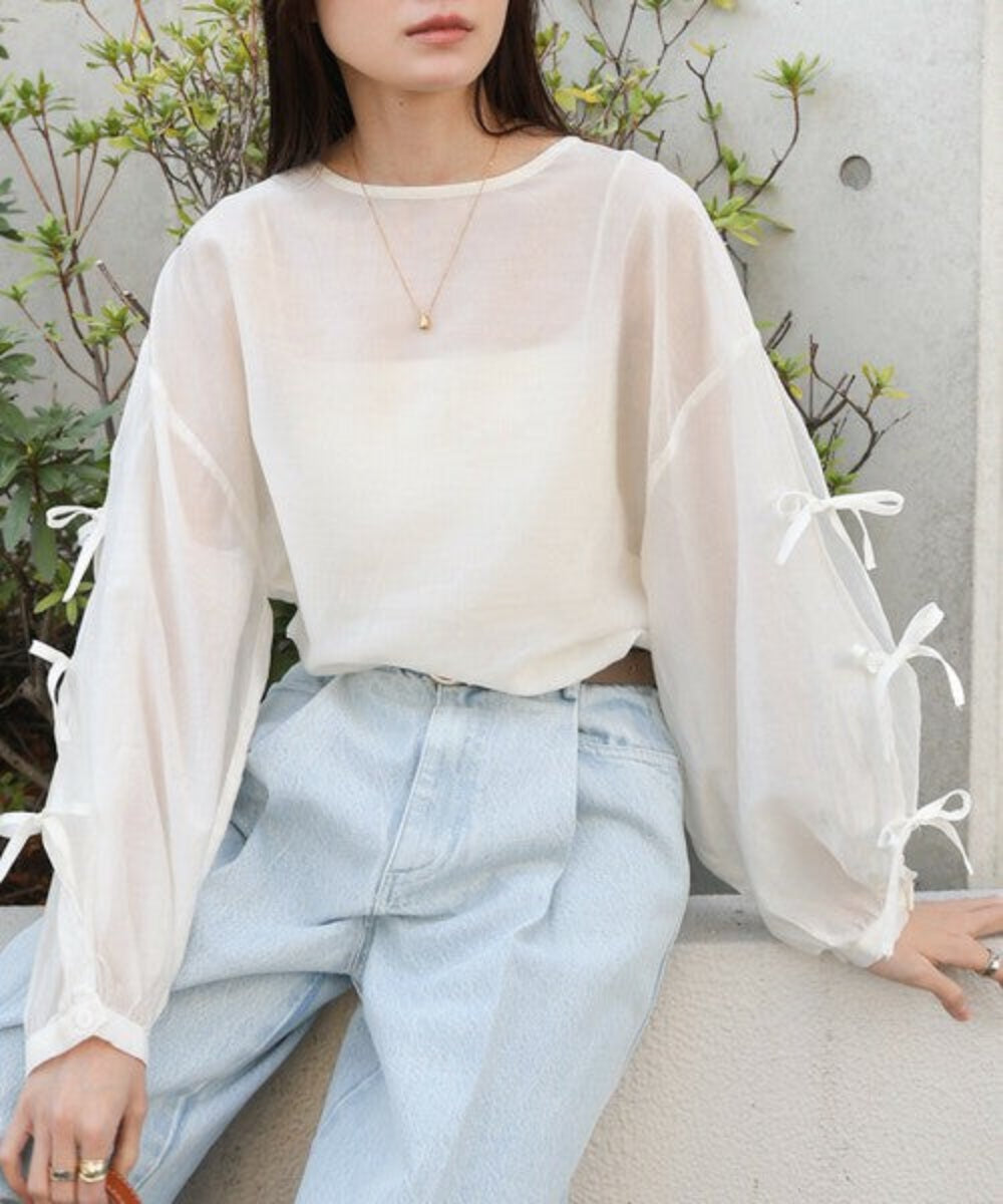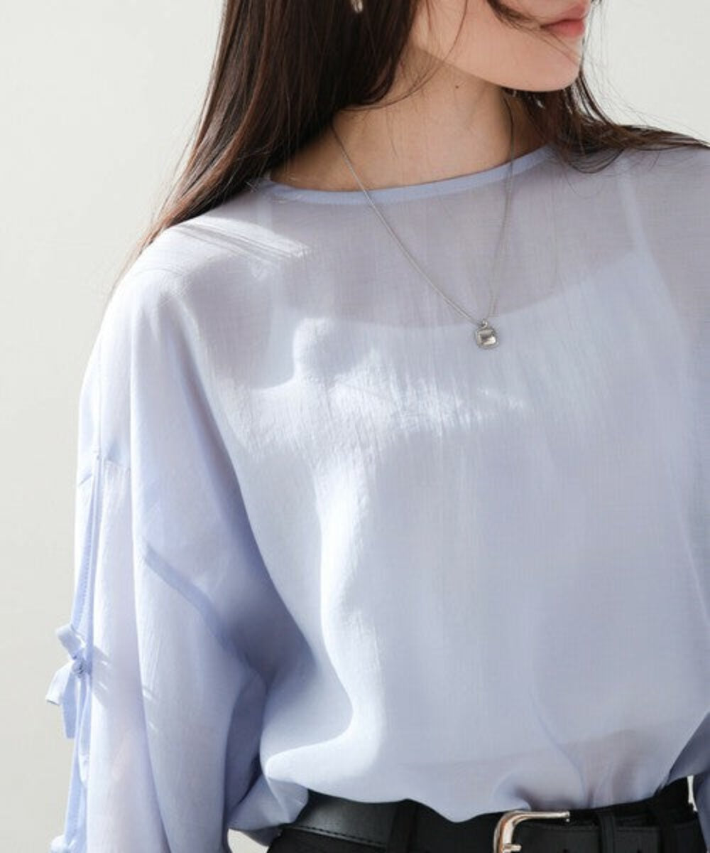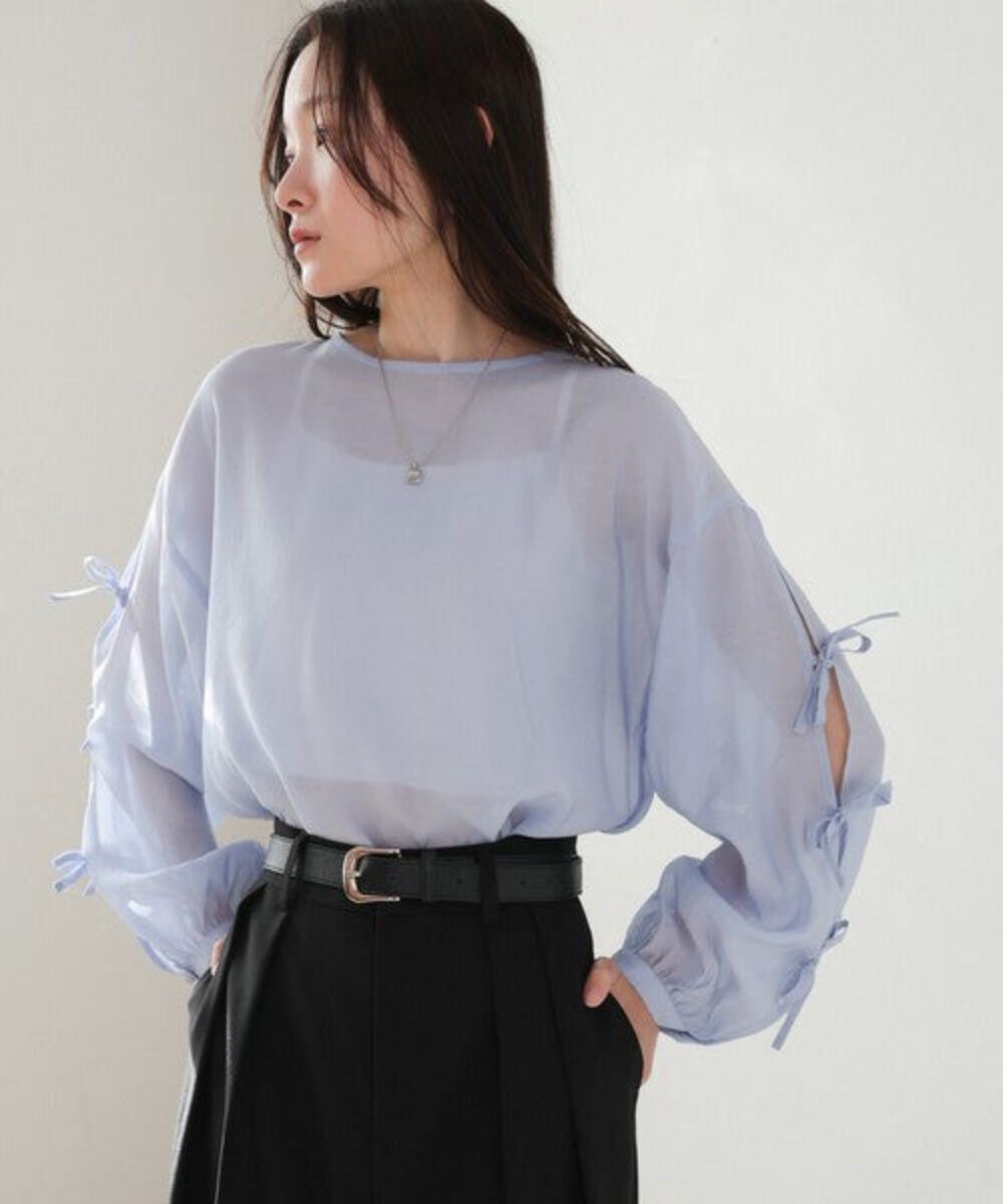 這款充滿春日氣息的襯衫採用半透明設計,袖口飾有緞帶。柔軟閃亮的布料凸顯了女性魅力。寬鬆的版型也十分吸引,落肩設計不顯身材曲線。即使將襯衫束進褲腰,及腰的長度也能給人安全感。柔和的淺色調更能展現成熟優雅的氣質。