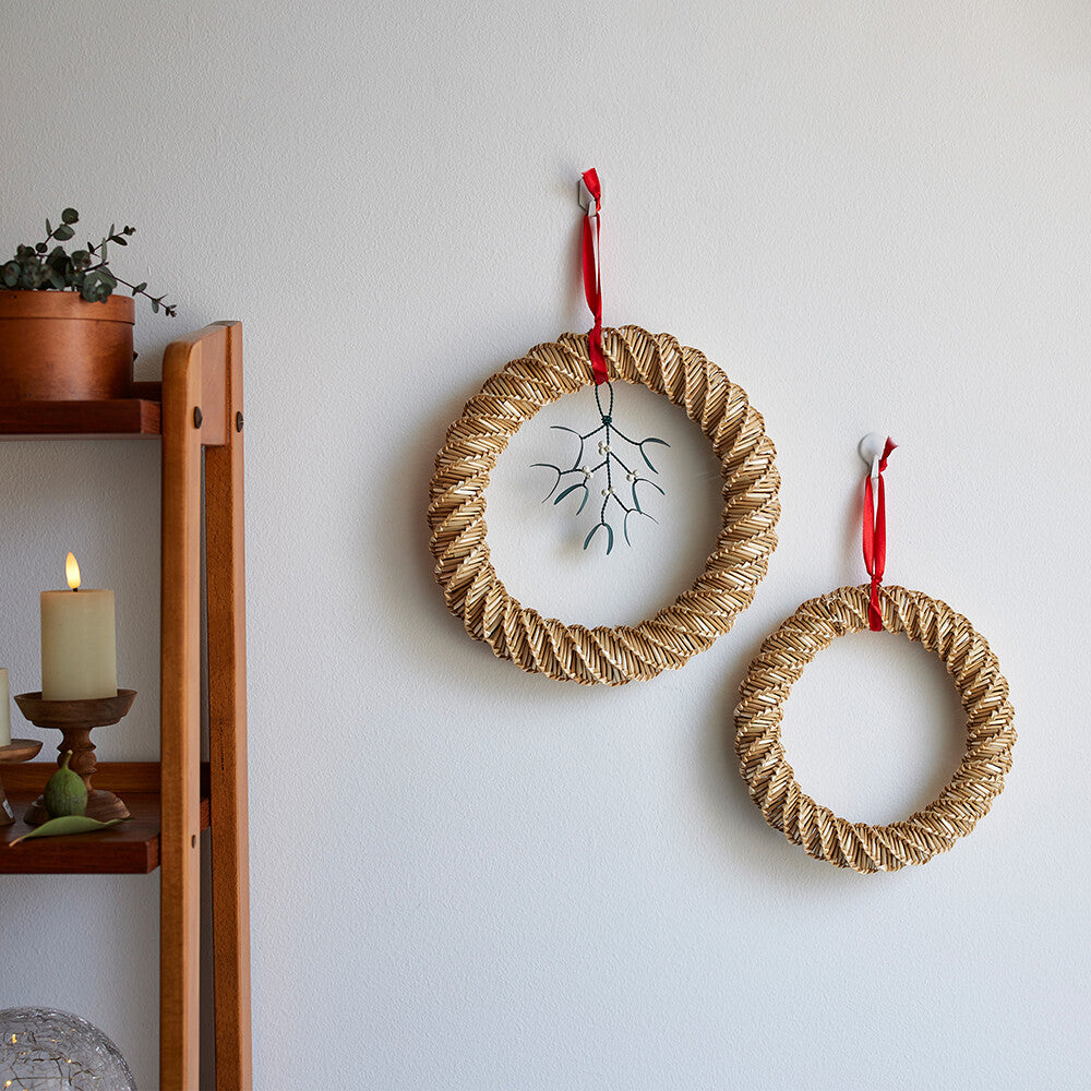 您可以將喜愛的植物纏繞其上,懸掛裝飾品製作成聖誕花環,或搭配草編花環。它還可以與裝飾品和南天松組合,作為新年裝飾,長久保存。