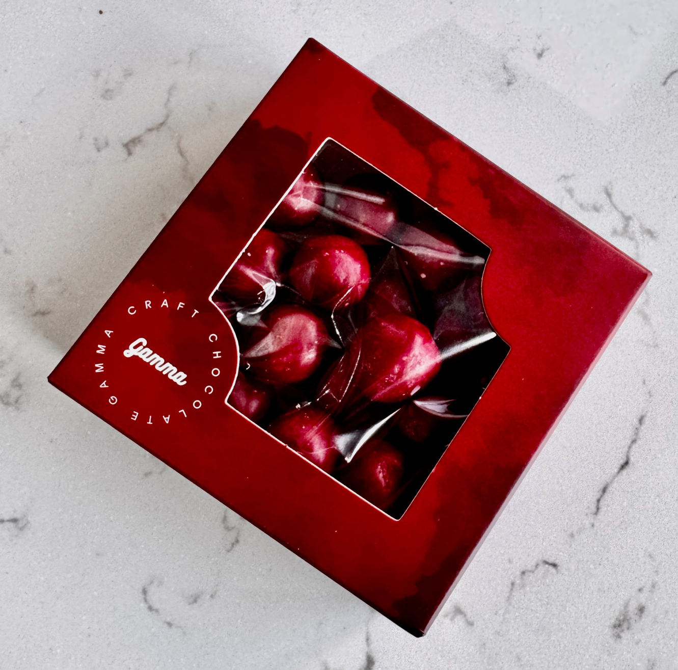 自家製作士多啤梨朱古力,酸甜水果風味配搭榛子香脆口感,經過包覆工序後成為可口小點;天然顏色鮮艷,聖誕小禮物佳品。