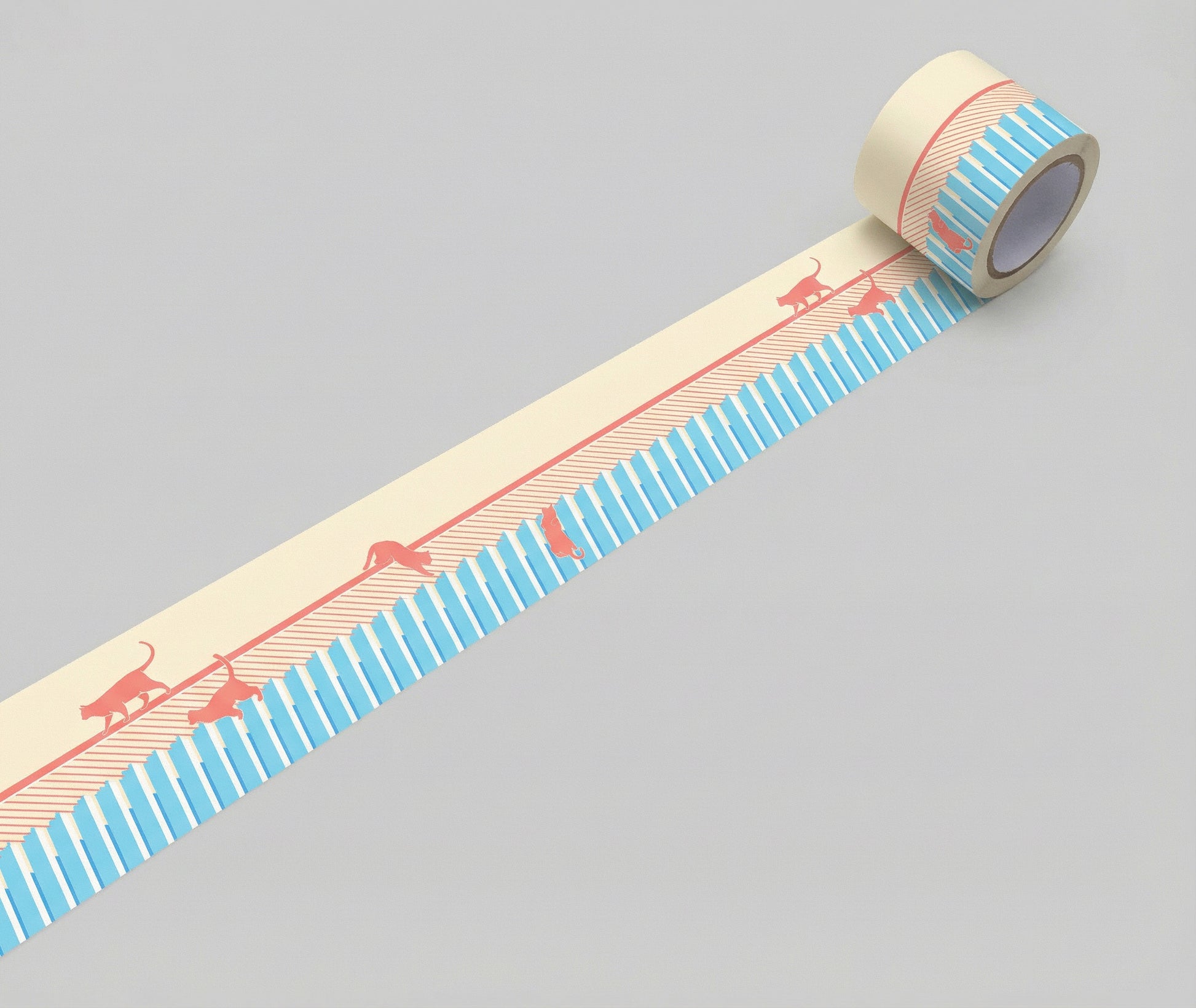 以無限延伸的樓梯為主題而繪畫貓咪爬樓梯的透明膠帶印。
