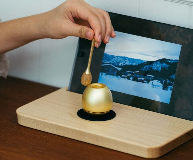以櫻花樹木製的磬棒放置在頂部的孔中,敲擊中後即使立即放回,聲音也不會停止。將磬放在附送的黑色墊上,聲音會更響亮。