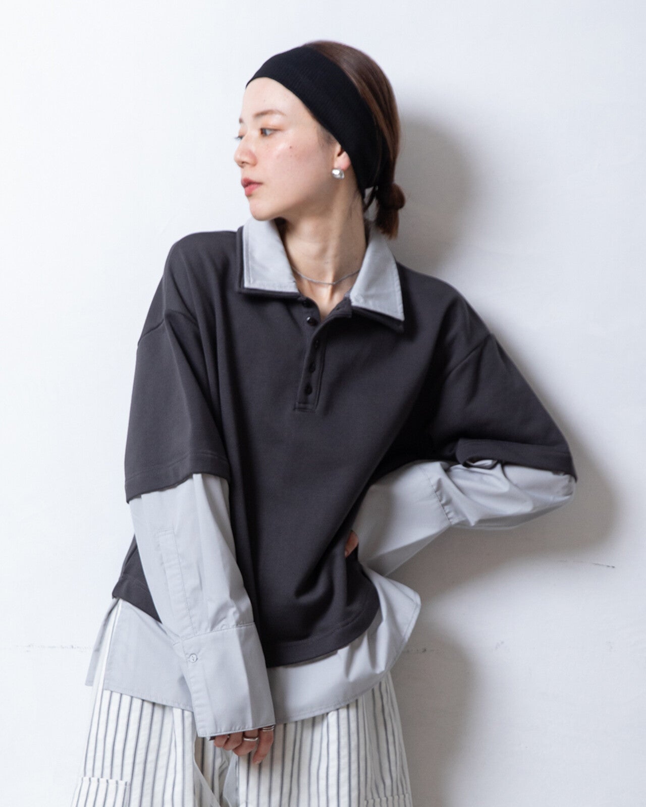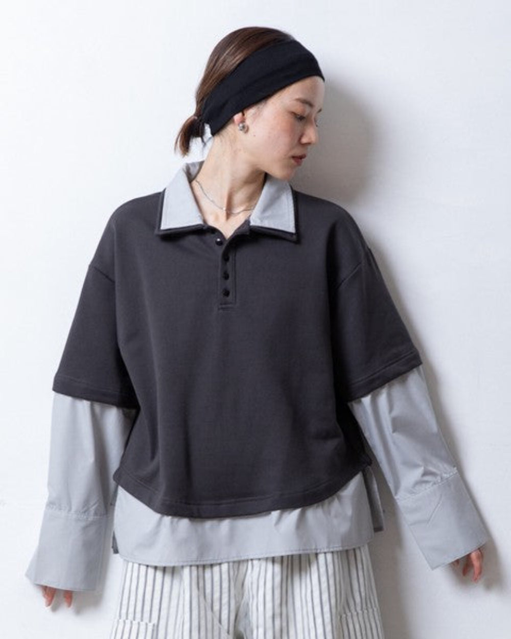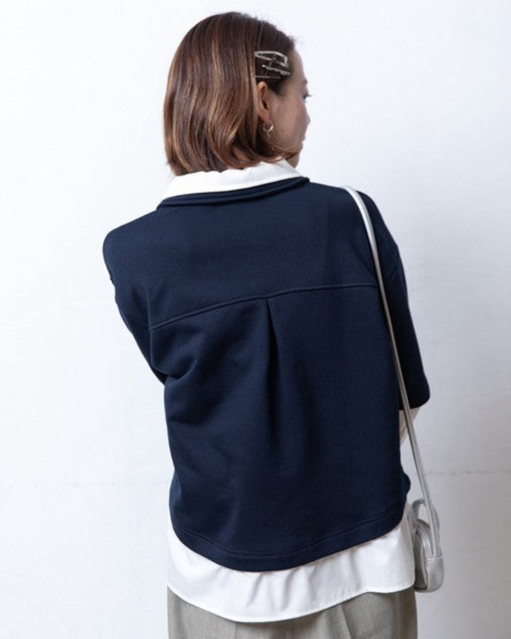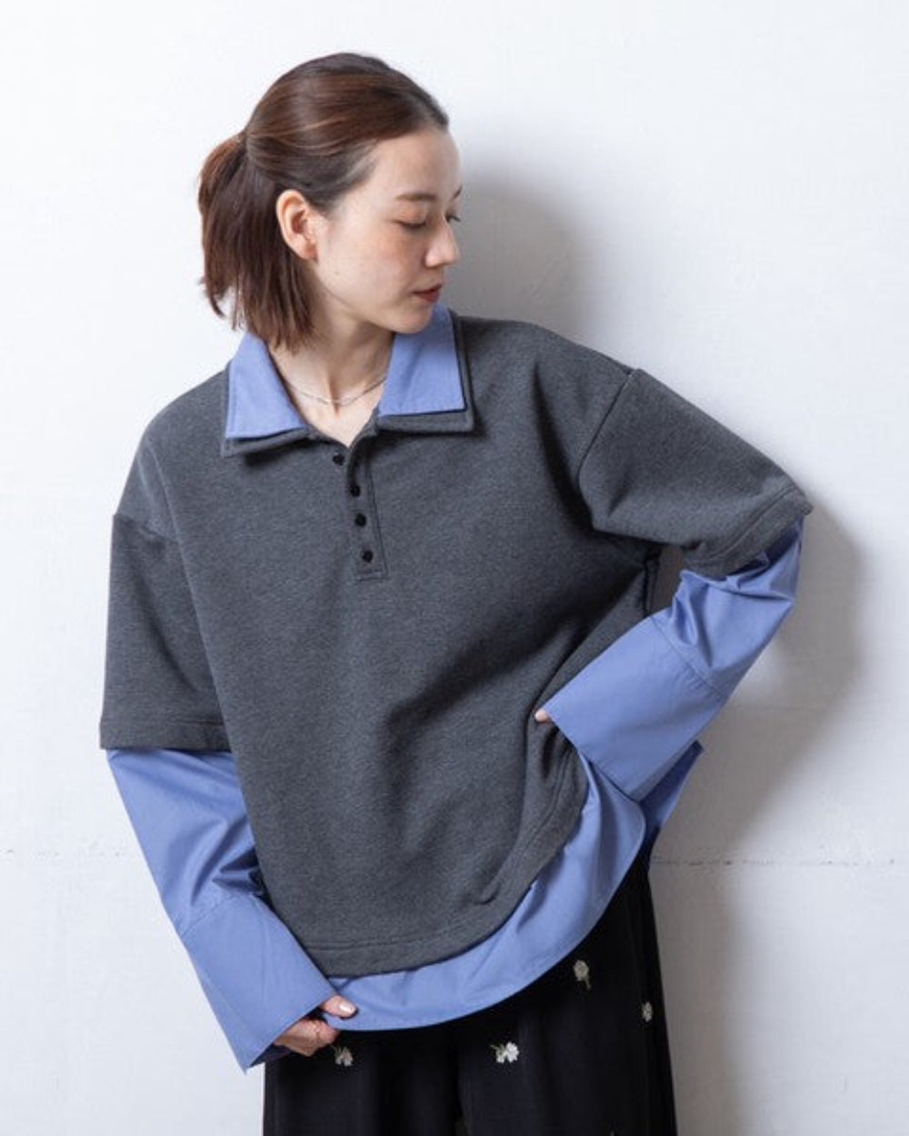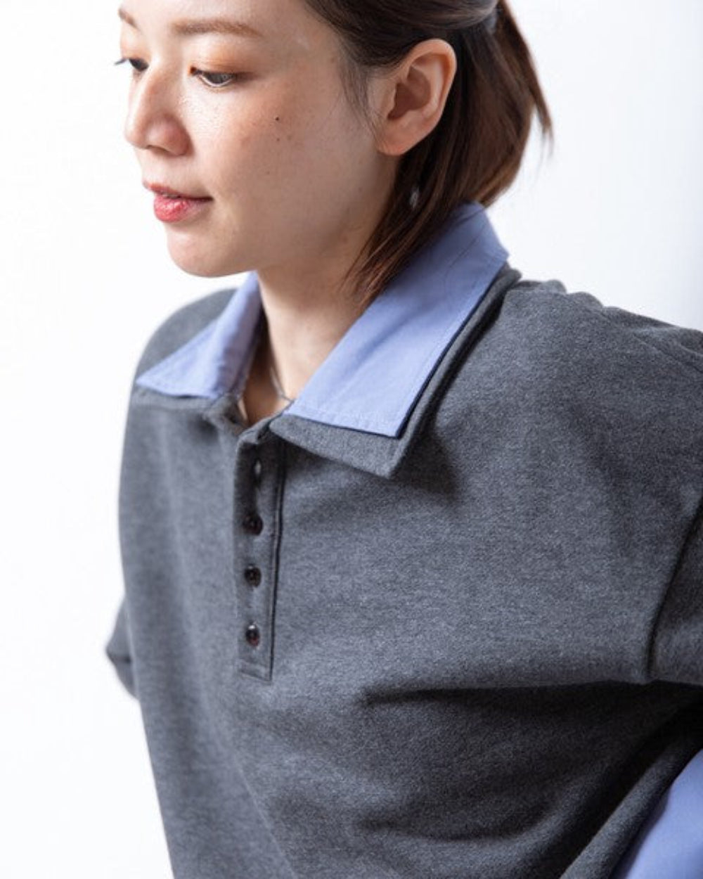 領口採用簡潔的 Polo 領設計。領口為休閒的衛衣布料增添了一絲成熟穩重的氣質,但又不顯得過於粗糙。寬鬆的尺碼,版型寬大。落肩設計讓肩部線條更加纖細,營造出舒適休閒的造型。袖口採用襯衫式設計,塞進褲腰後更顯蓬鬆飽滿。