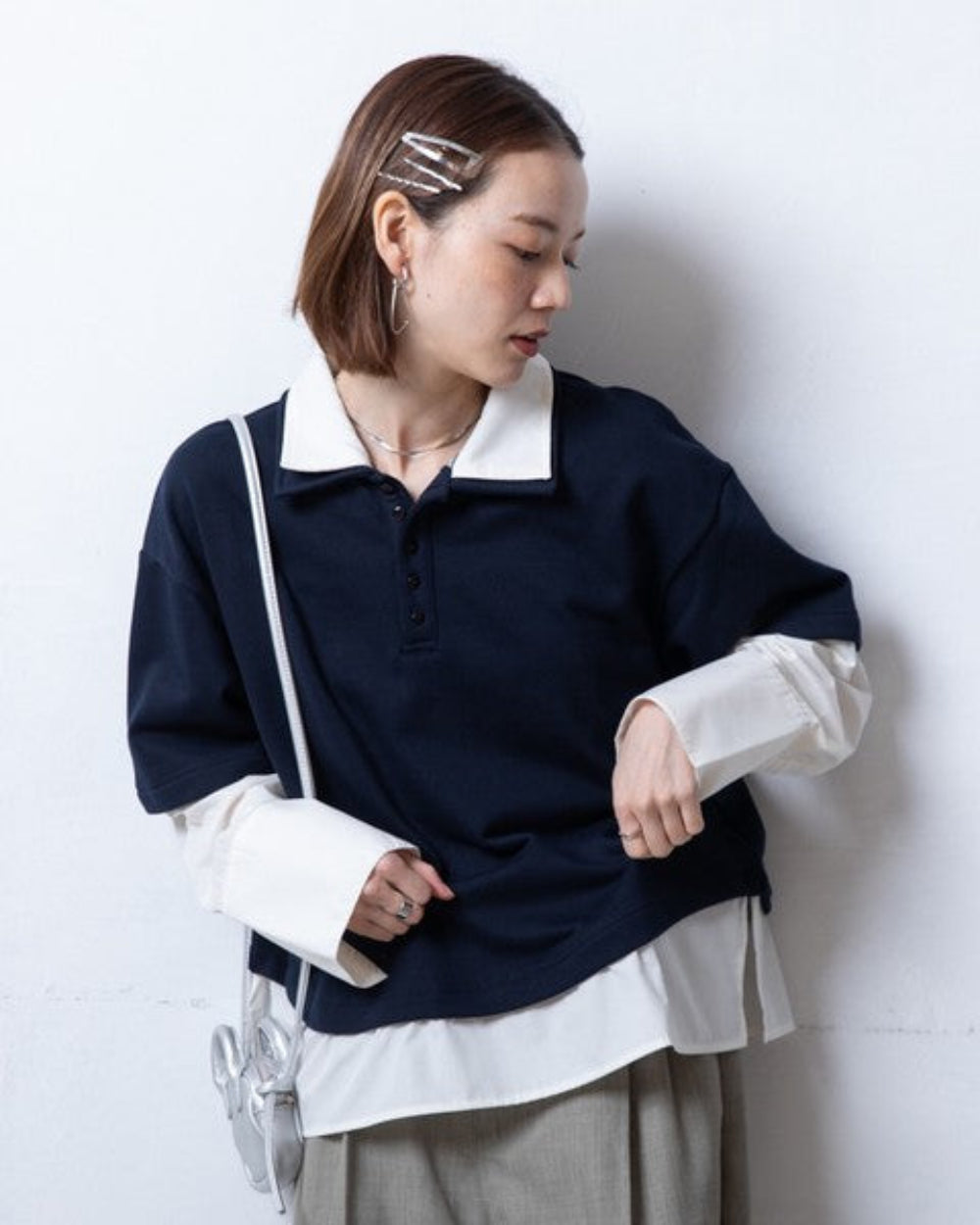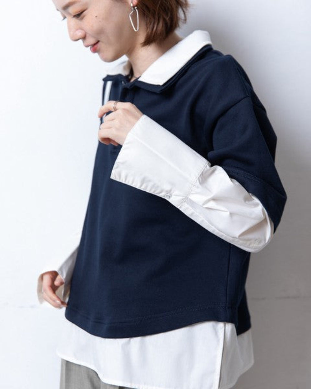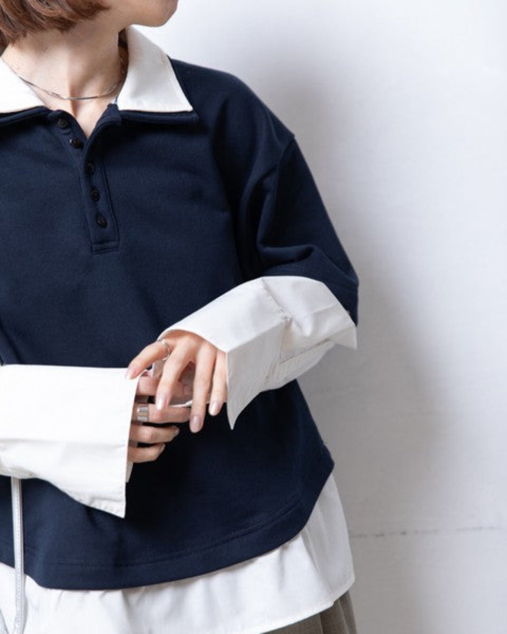 看起來像是Polo衫疊穿了另一件襯衫。精心設計的疊穿方式,無需任何技巧,即可打造出精緻的傳統風格。襯衫布料在領口和下擺處巧妙地拼接。長度恰到好處,彷彿從上衣下擺中若隱若現,既增添了層次感,又自然地遮住了腰部。