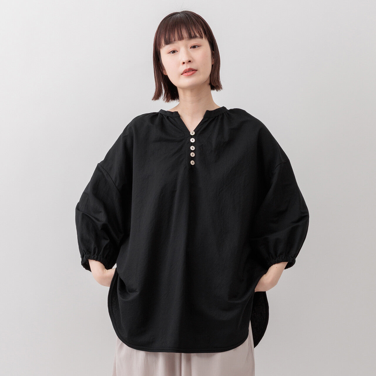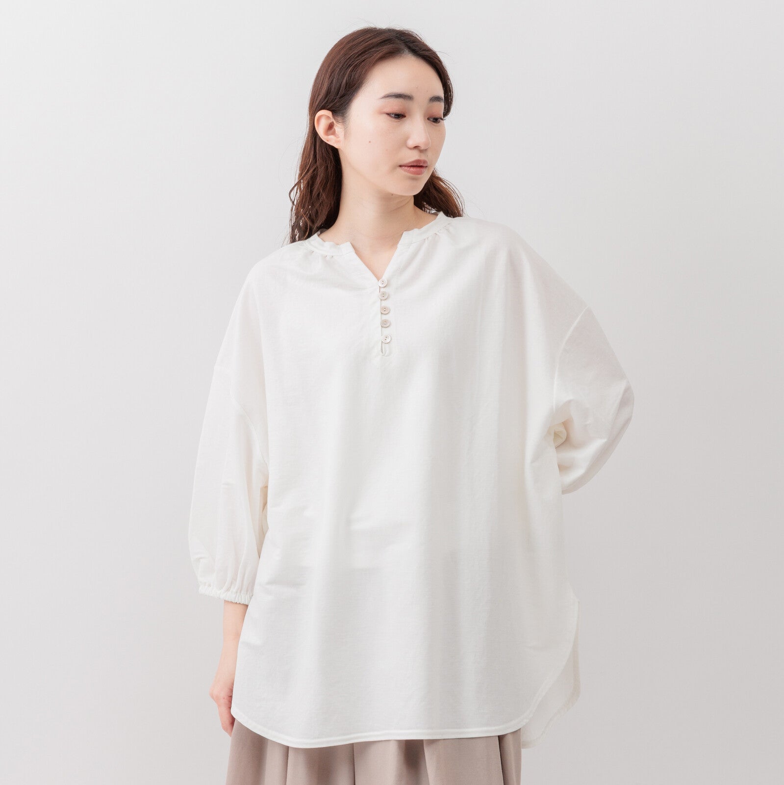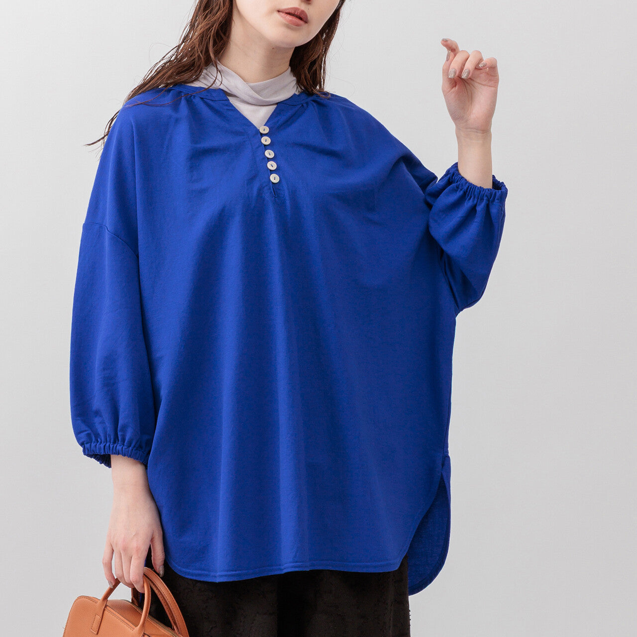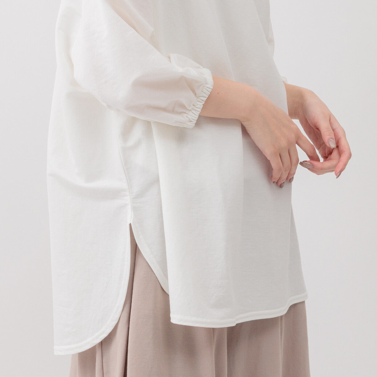 四分之三長度的袖子以及前後長度方便活動。舒適材質,讓夏天時尚清涼。