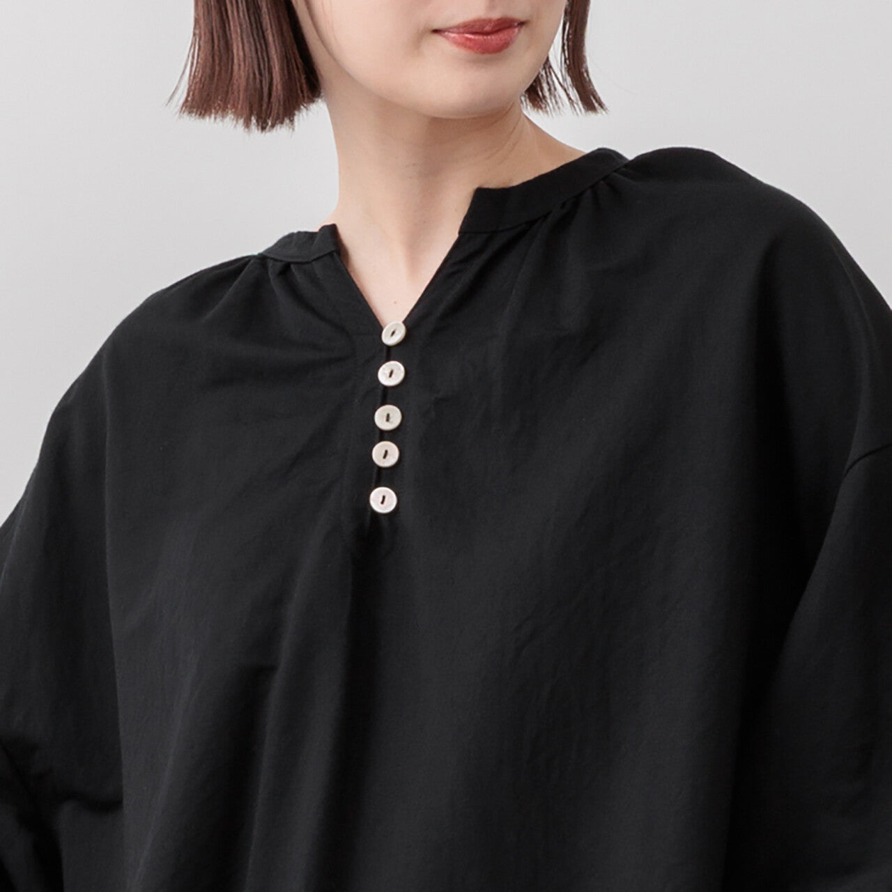一件看起來優雅的襯衫,隨意點綴著貝殼紐扣。