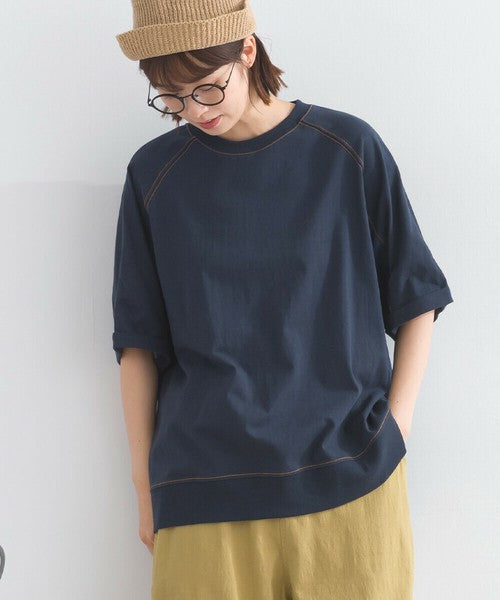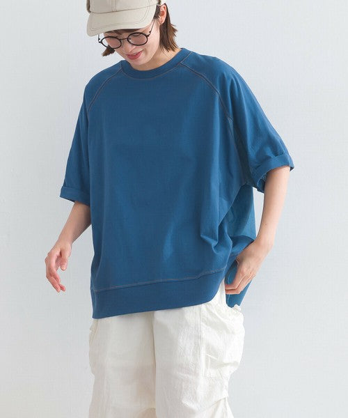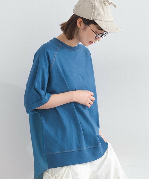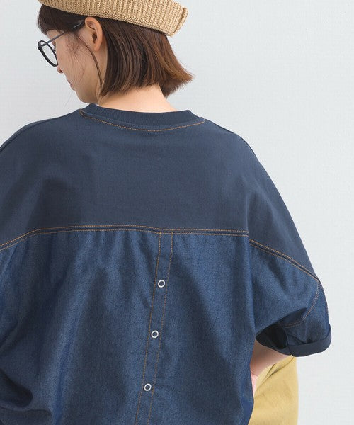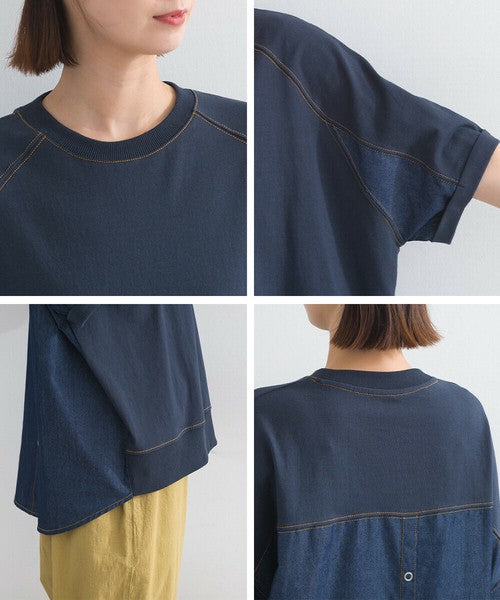 正面採用觸感輕盈柔軟的針織布料,帶來輕盈柔軟的穿著體驗。背面採用硬度適中的牛仔布料,賦予其立體感和存在感。落肩設計和寬鬆的衣身寬度營造出輕鬆舒適的穿著體驗。下擺和袖口採用羅紋設計,為休閒風格增添了整體感。