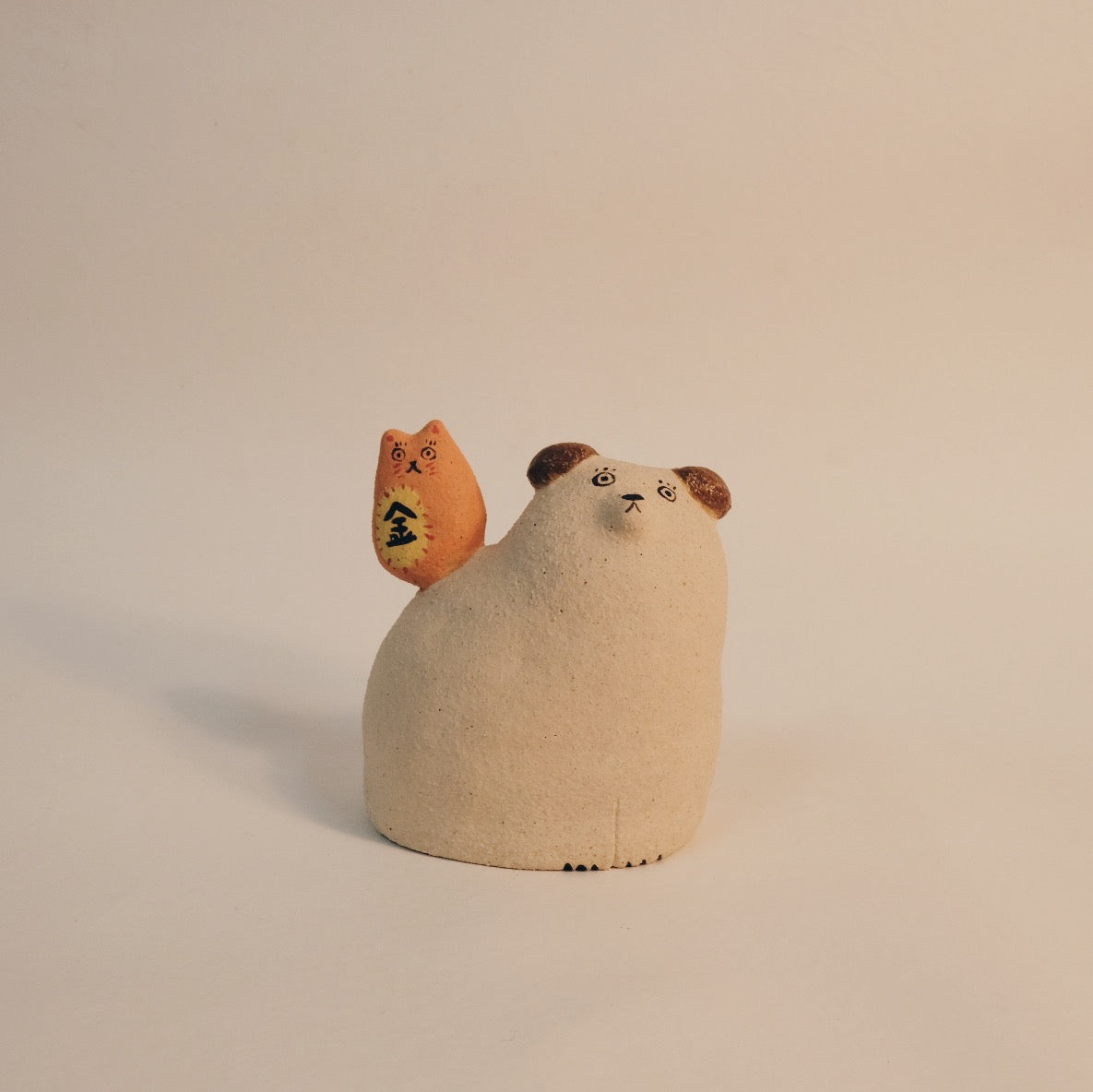 手捏小陶偶,以陶瓷顏料上色,燒至1230度,有些土內有小石頭,燒完作品表面會呈現不同的質感