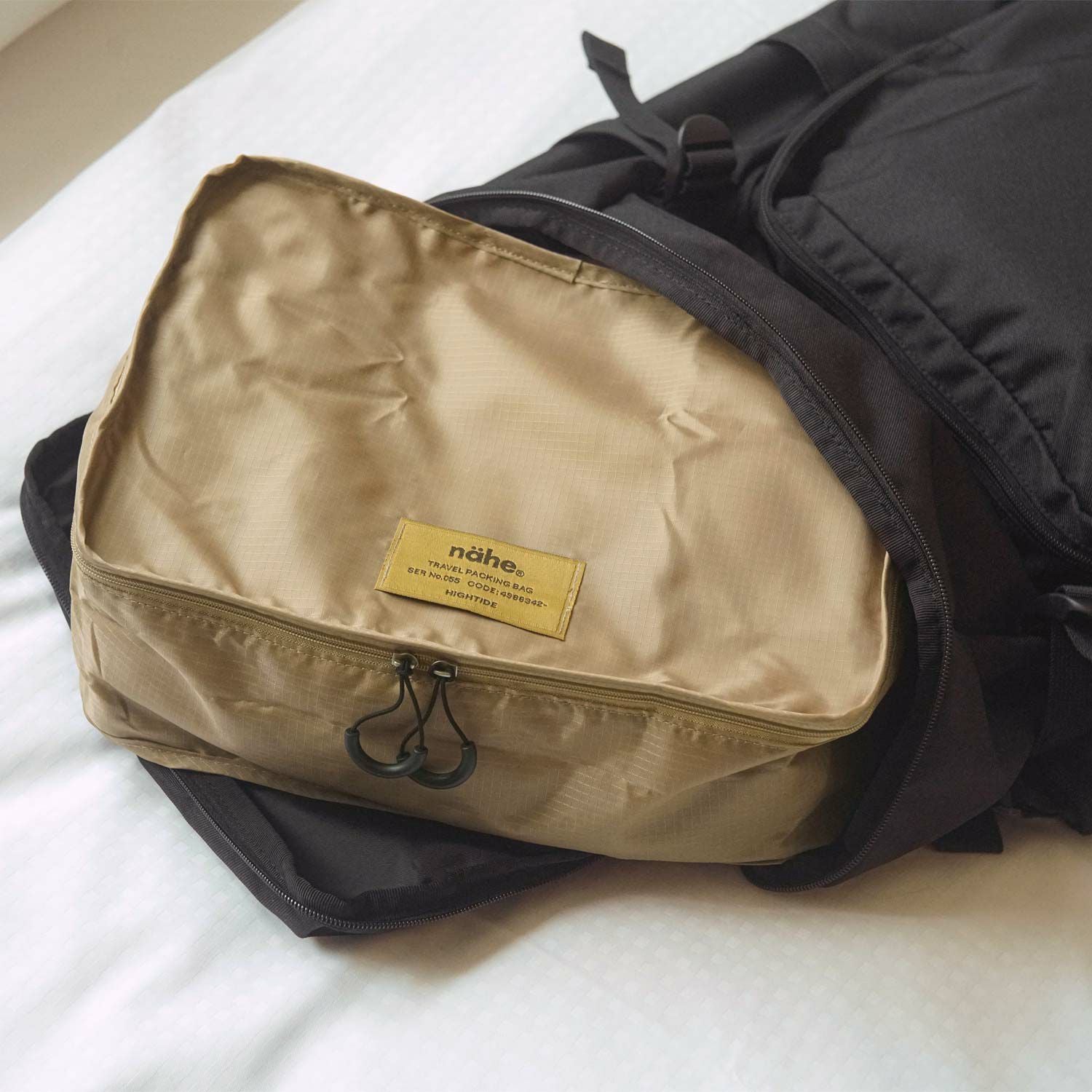 nähe 的旅遊收納包全新升級,設計協助您有效率地打包。它配備一個網袋,方便您存放舊衣物,方便清洗,回家後輕鬆整理。背面還設有拉鍊口袋,方便您存放和分類需要快速取用的物品。這款多功能收納包非常適合存放難以觸及的地方。