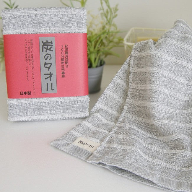 具有清爽摩擦質感的身體毛巾,由含有紀州備長炭的100% 植物纖維製成。