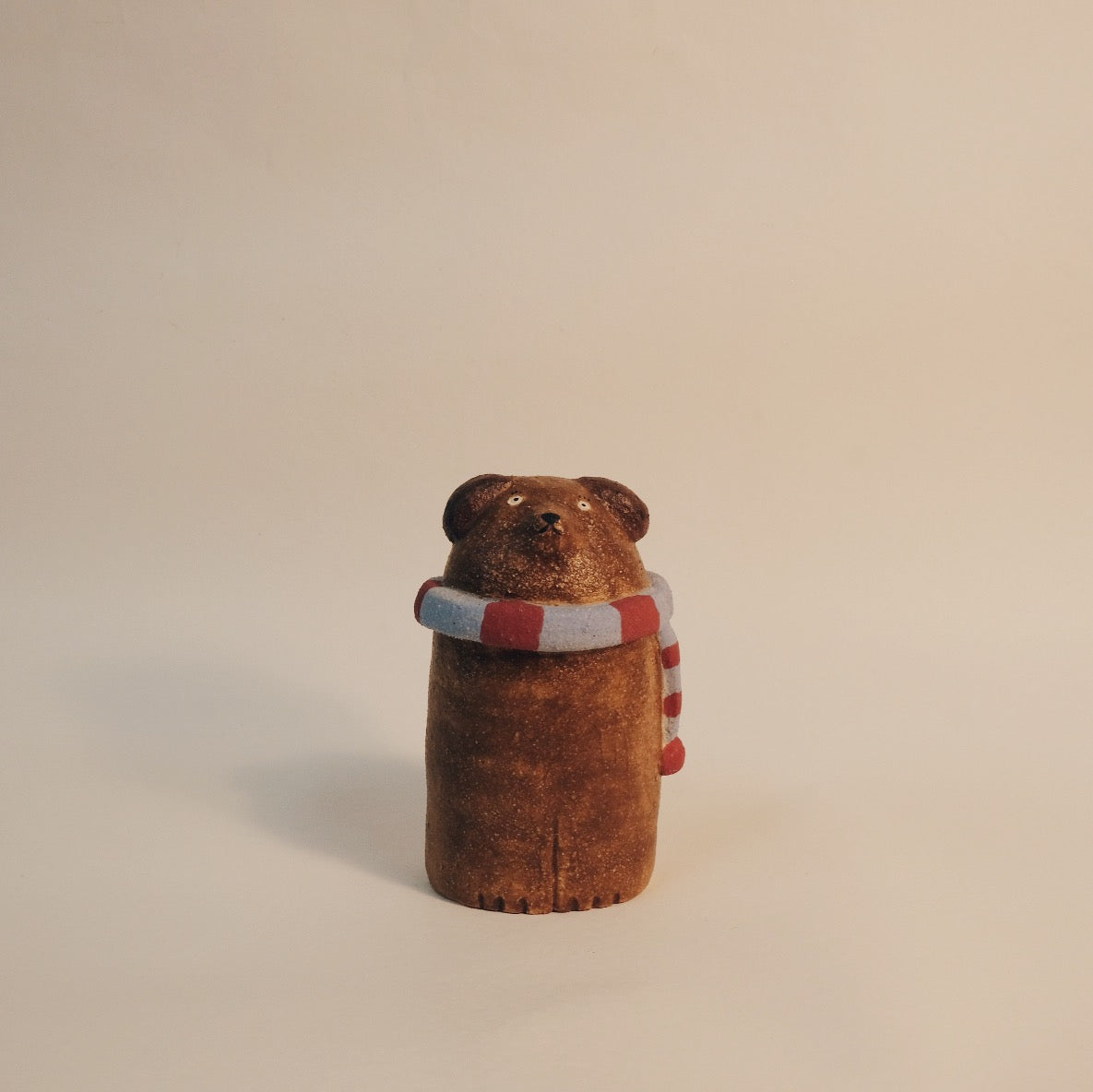 手捏小陶偶,以陶瓷顏料上色,燒至1230度,有些土內有小石頭,燒完作品表面會呈現不同的質感