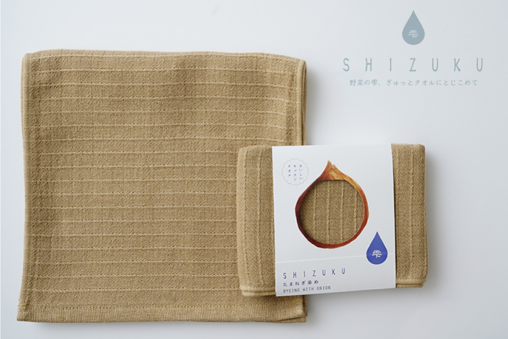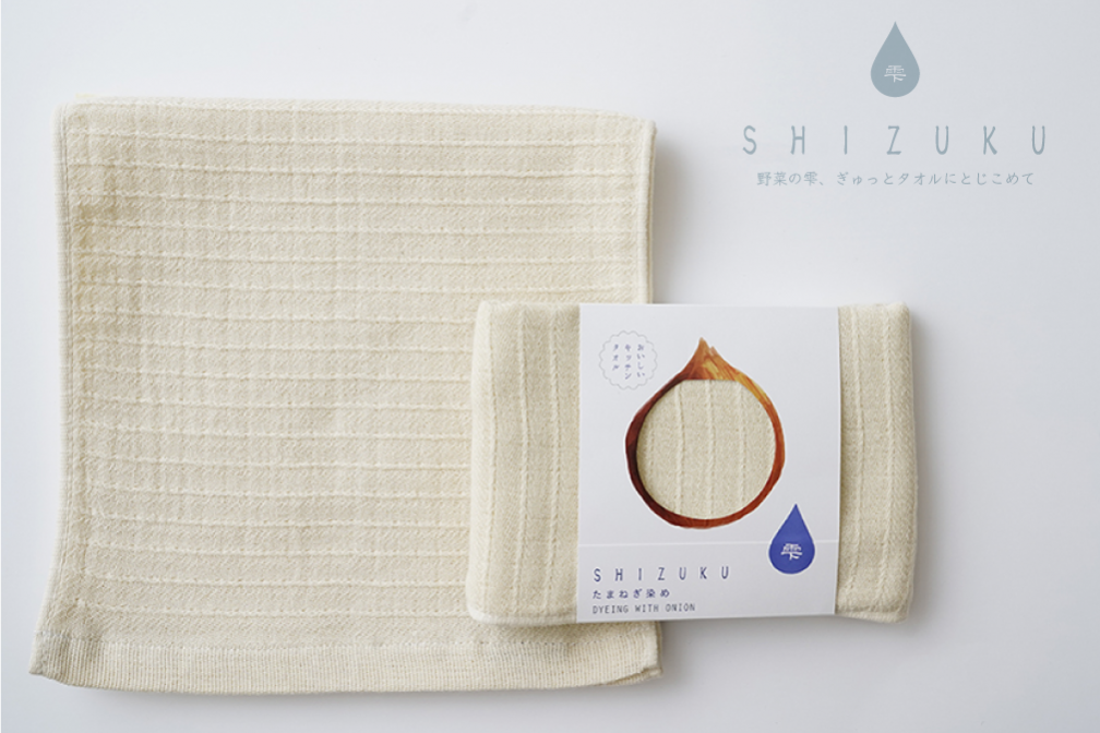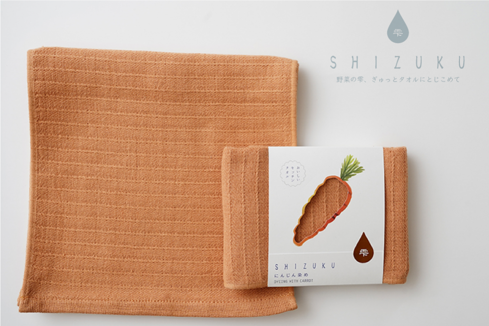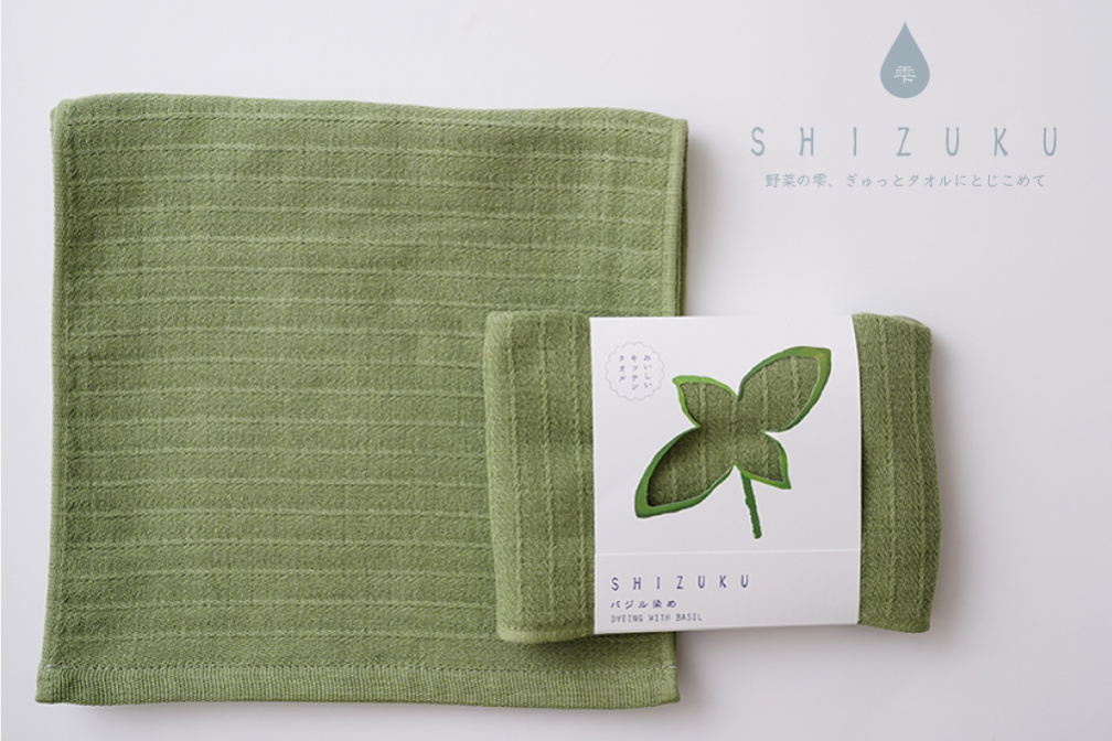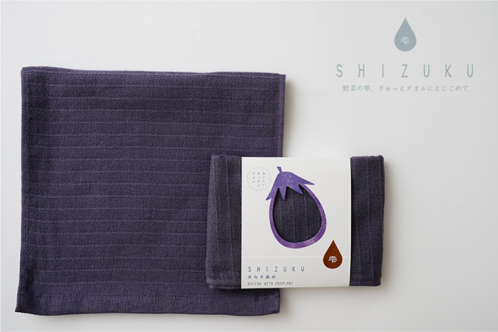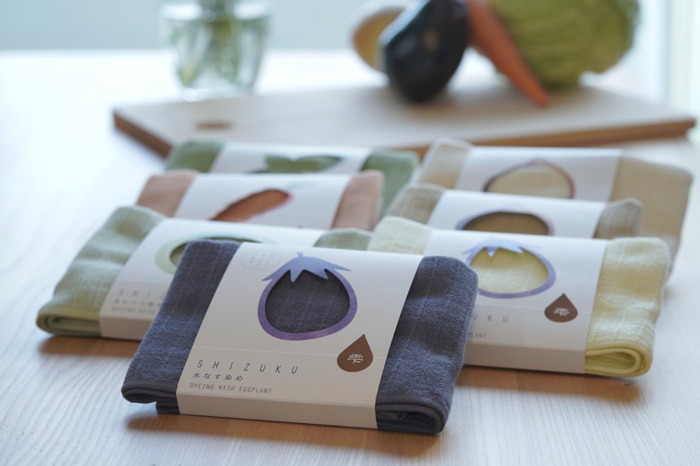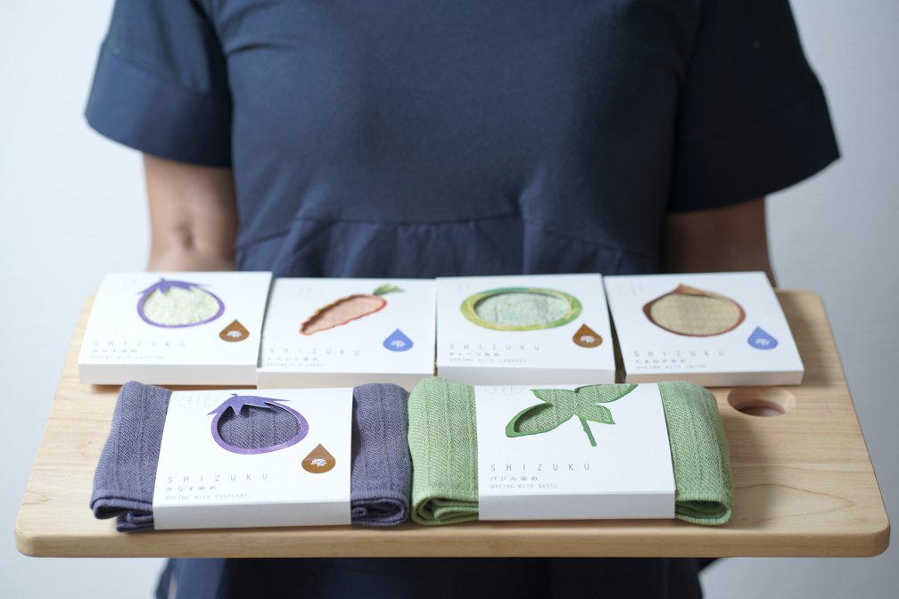 雫 Shizuku 將南大阪盛產「水茄子」、「泉州洋蔥」、「松波椰菜」、「彩譽胡蘿蔔」和羅勒葉的葉、種子和皮等分選後將色素抽出製成染料。從5種蔬果中,製作所成功製作出 7種顏色。