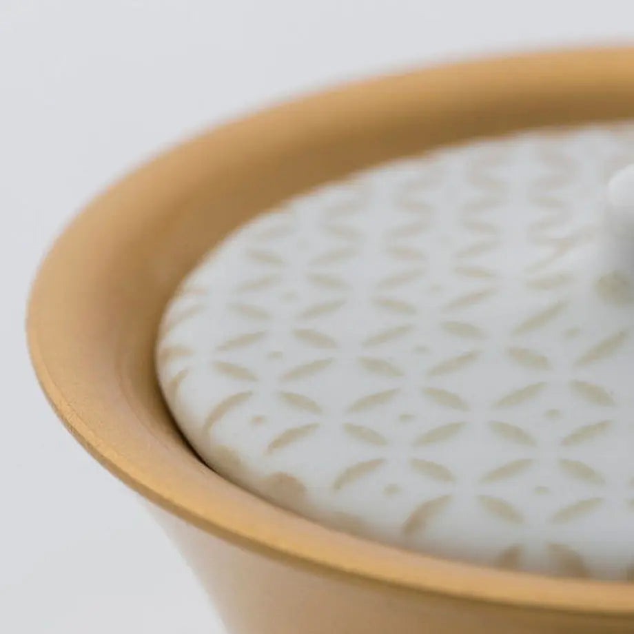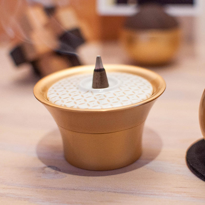 上部份是香座,日本製造的陶器蓋能夠一邊安插線香,反轉另一邊可以安座塔香。黃銅香座配以日本傳統花紋更添華麗感覺。